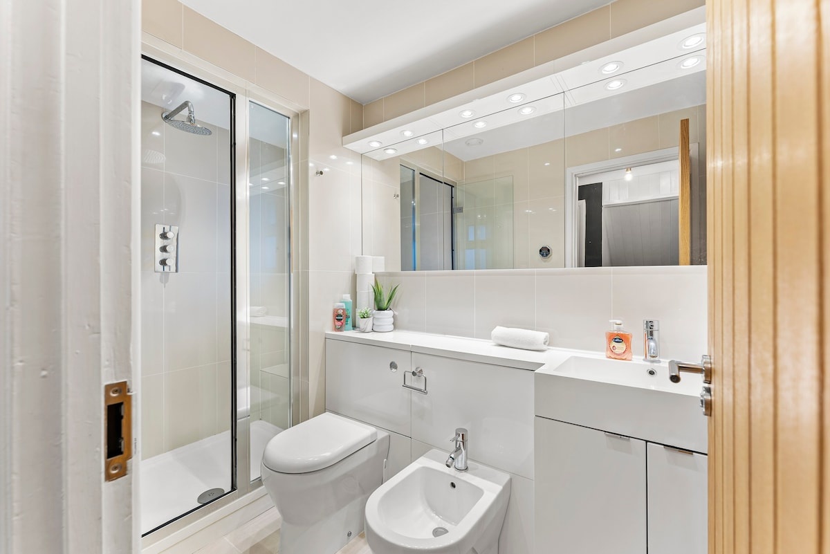 ➞ There is a bright and clean bathroom.